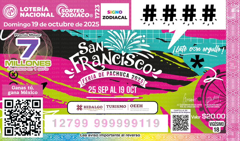 Este diseño conmemorativo del boleto de Lotería Nacional para la Feria de San Francisco Pachuca 2025 proyecta una identidad vibrante, moderna y festiva. Los colores neón (magenta, verde y azul) evocan energía, dinamismo y juventud, transmitiendo la grandeza y vitalidad de la feria más importante de Hidalgo. Los elementos gráficos —fuegos artificiales, rueda de la fortuna, trazos enérgicos y patrones geométricos— simbolizan tradición, diversión y modernidad, logrando un equilibrio entre lo popular y lo contemporáneo. La tipografía orgánica y llamativa de San Francisco refuerza la idea de celebración y cercanía con la gente, mientras el slogan "¡Late con orgullo!", conecta emocionalmente con el público al resaltar identidad y pertenencia. En conjunto, este boleto no solo comunica la fecha y relevancia del evento, sino que se convierte en un ícono visual que celebra a Hidalgo y posiciona la feria como un referente nacional de cultura, entretenimiento y orgullo colectivo. La Feria de San Francisco Pachuca, Hidalgo, es una de las celebraciones más representativas del Estado, con una trayectoria que refleja la historia, la fe y la identidad de los hidalguenses, esta gran fiesta se consolida como un espacio de encuentro familiar, expresión artística y reactivación económica, que muestra el compromiso del Gobierno del Estado por fortalecer los valores culturales y generar bienestar para la población. Durante el Porfiriato, la feria alcanzó gran prestigio y comenzó a atraer visitantes de otras regiones. A lo largo del siglo XX cambió de sede varias veces, hasta que en 1992 s e inauguró el Recinto Ferial de Pachuca, espacio que marcó el inicio de su etapa moderna. Desde entonces, la feria ha evolucionado hasta convertirse en un evento de talla nacional e internacional, con espectáculos, exposiciones artesanales y artísticas, sin perder su esencia. Con ello, la feria no solo es un espacio de diversión, si no también una oportunidad de crecimiento para pequeños comerciantes, productores y artesanos que muestran con orgullo el talento y l a creatividad del estado. La Feria de San Francisco Pachuca Hidalgo 2025 simboliza el orgullo de ser hidalguense. Gracias a los esfuerzos del gobernador Julio Menchaca, esta edición no solo celebra la tradición, sino que también impulsa el desarrollo económico, fomenta la inclusión social y consolida a Hidalgo como un destino de cultura, alegría y transformación.