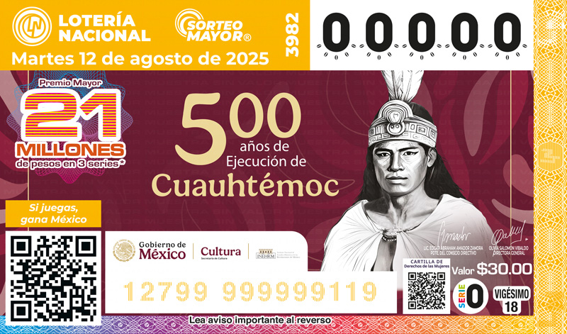 A 500 años de su muerte, Cuauhtémoc sigue siendo símbolo de valentía, dignidad y resistencia. Último Huey Tlatoani de México-Tenochtitlan, asumió el liderazgo tras la muerte de Moctezuma II y Cuitláhuac, enfrentando con coraje el asedio español. Capturado el 13 de agosto de 1521, pidió la muerte como guerrero ante Hernán Cortés, pero fue hecho prisionero y ejecutado en la expedición a las Hibueras el 28 de febrero de 1525. Hoy es recordado como un héroe del México prehispánico, cuya figura ha sido inmortalizada en el arte, como en el mural Epopeya del pueblo mexicano de Diego Rivera, donde aparece como un águila descendente, símbolo de su espíritu combativo. Para Lotería Nacional, conmemorar los 500 años de la muerte de Cuauhtémoc es una forma de reconocer el valor de nuestras raíces, rendir homenaje a la historia indígena de México y dar visibilidad a quienes forjaron la identidad de nuestra nación. A través de este sorteo, se honra su legado y se promueve el orgullo por nuestro pasado, fortaleciendo la memoria colectiva del pueblo mexicano.
